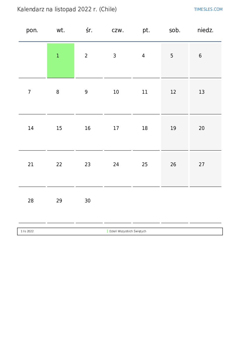 Kalendarz na listopad 2022 r. dla Chile
