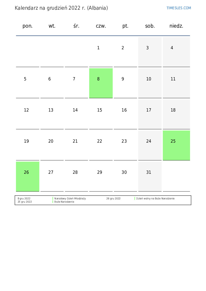 Pobierz i wydrukuj kalendarz PDF ze świętami i weekendami na grudzień 2022 r. dla Albanii