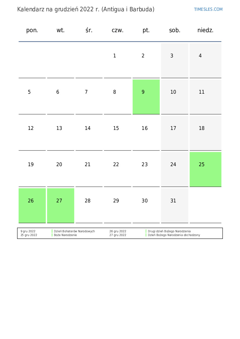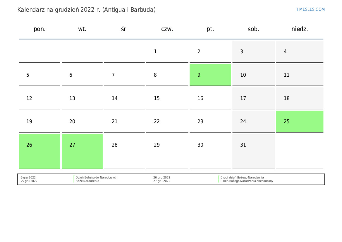 Kalendarz na grudzień 2022 r. dla Antigui i Barbudy