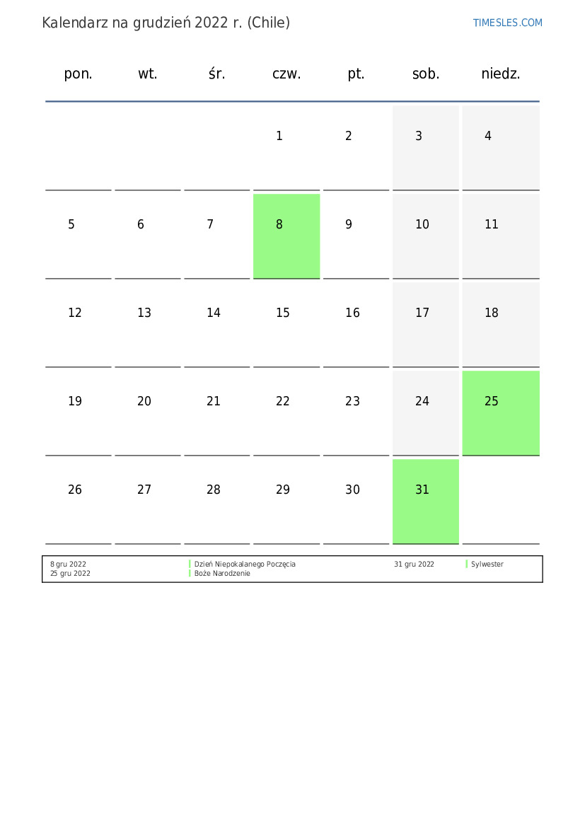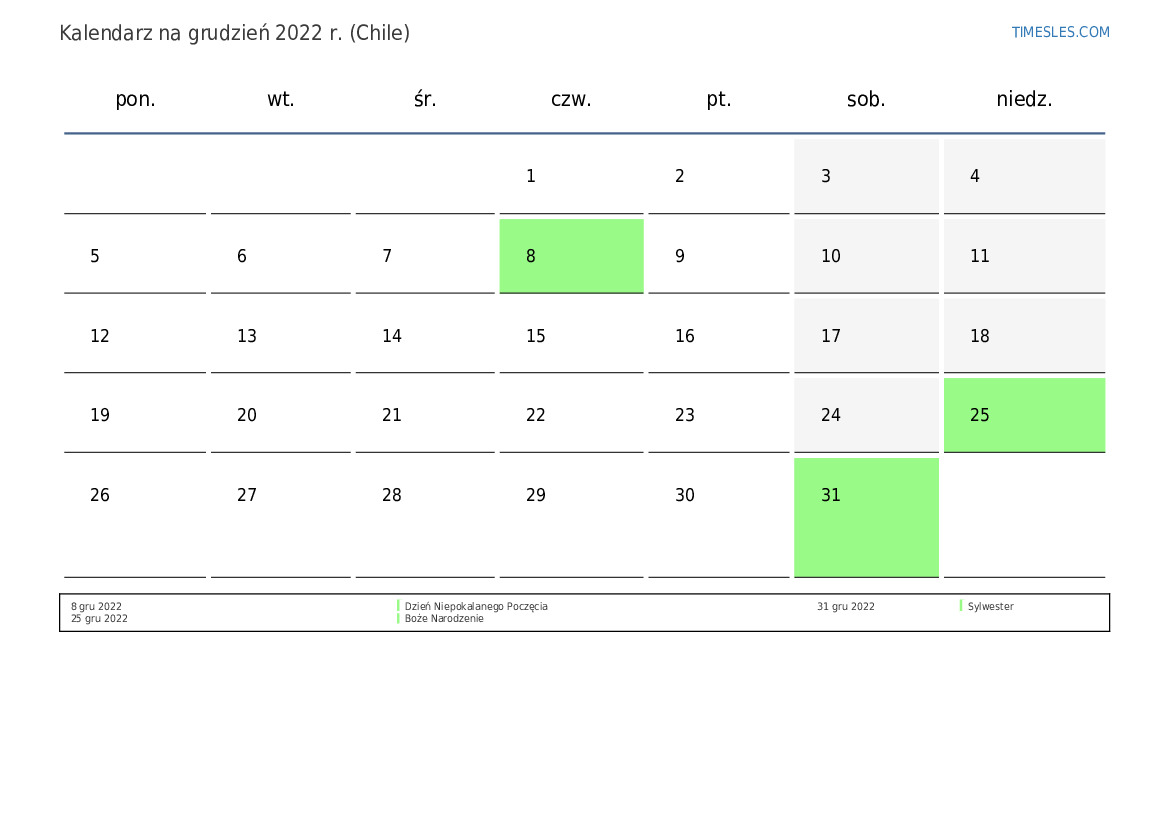 Pobierz i wydrukuj kalendarz PDF ze świętami i weekendami na grudzień 2022 r. dla Chile