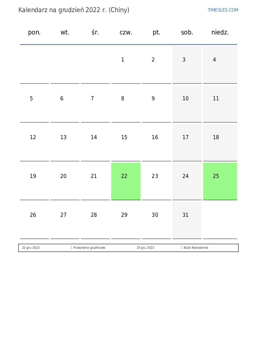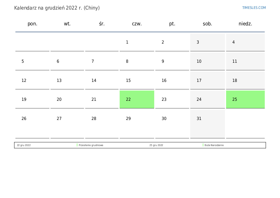 Pobierz i wydrukuj kalendarz PDF ze świętami i weekendami na grudzień 2022 r. dla Chin
