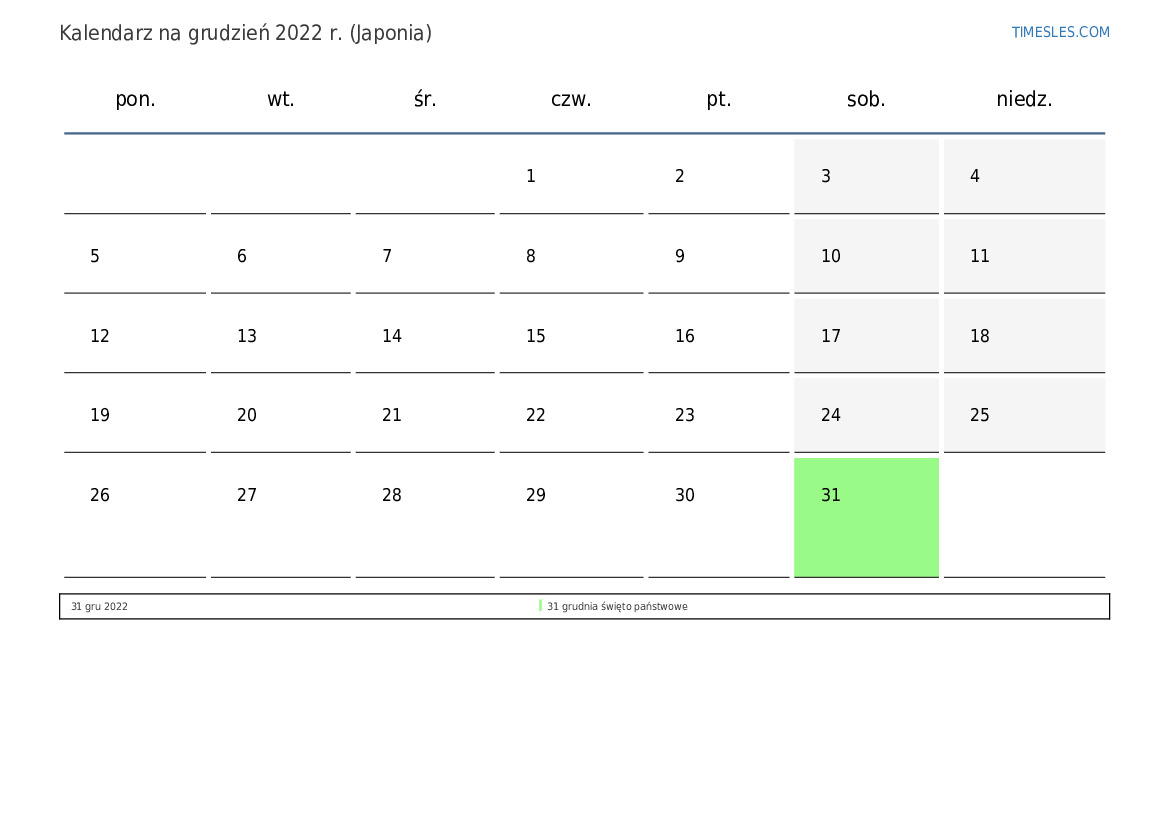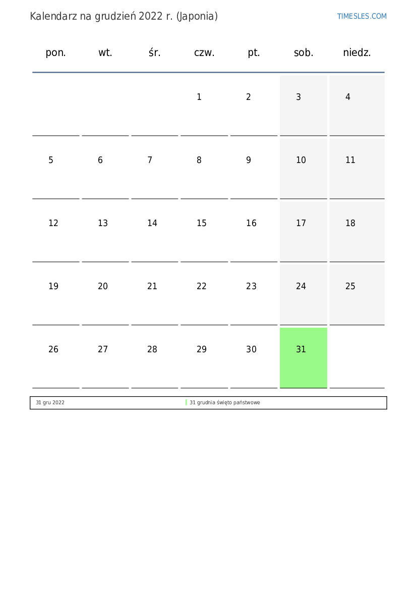 Kalendarz na grudzień 2022 r. dla Japonii