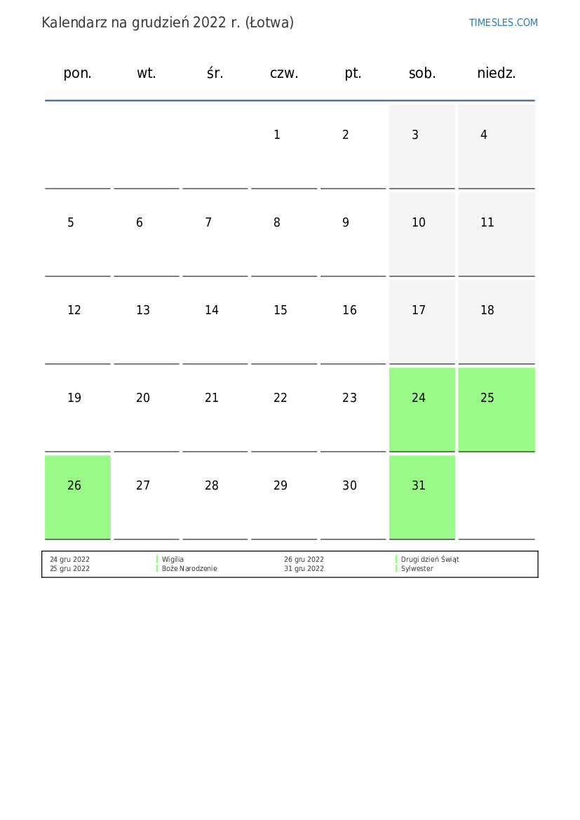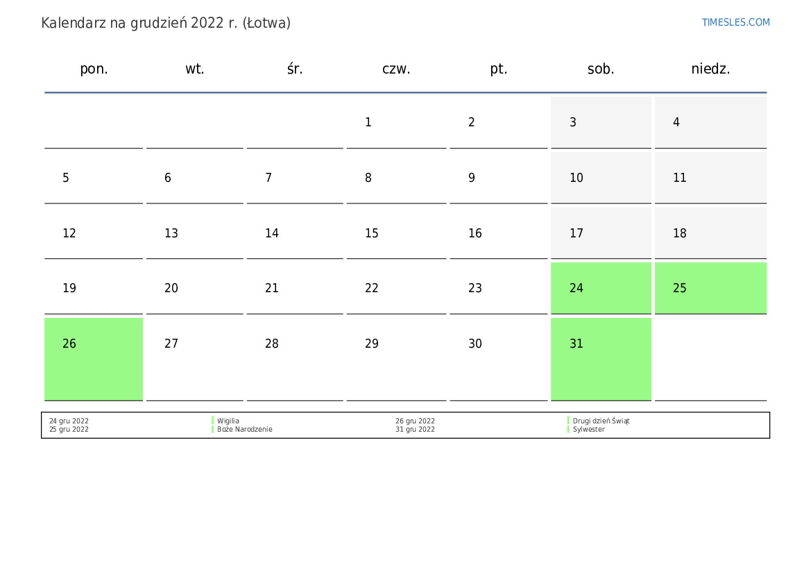 Pobierz i wydrukuj kalendarz PDF ze świętami i weekendami na grudzień 2022 r. dla Łotwy