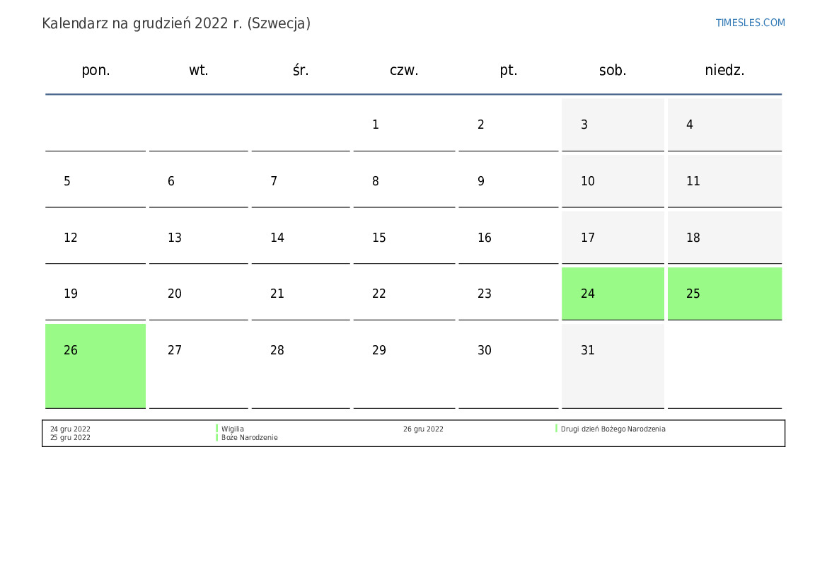 Pobierz i wydrukuj kalendarz PDF ze świętami i weekendami na grudzień 2022 r. dla Szwecji