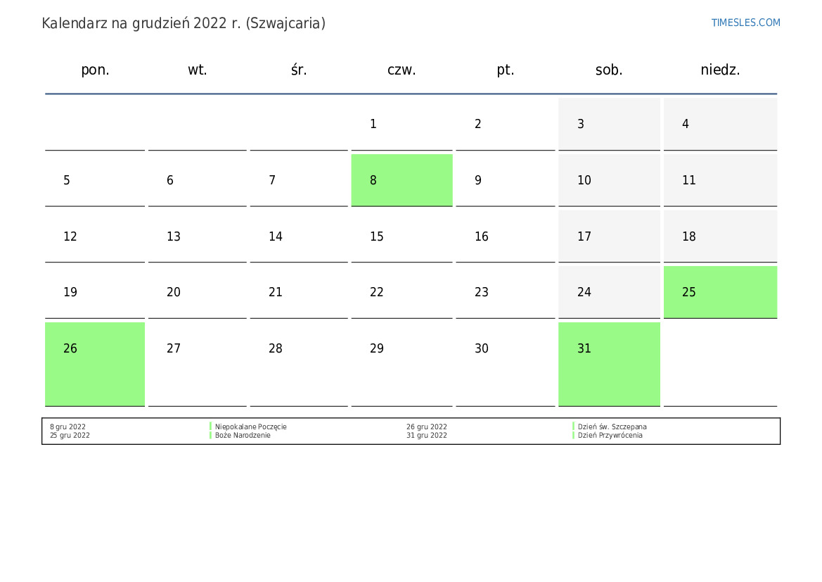 Kalendarz świąt i weekendów na grudzień 2022 r. dla Szwajcarii