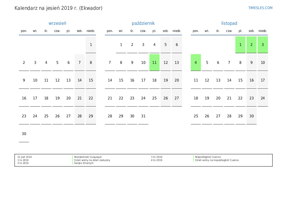 Kalendarz na jesień 2019 r. dla Ekwadoru