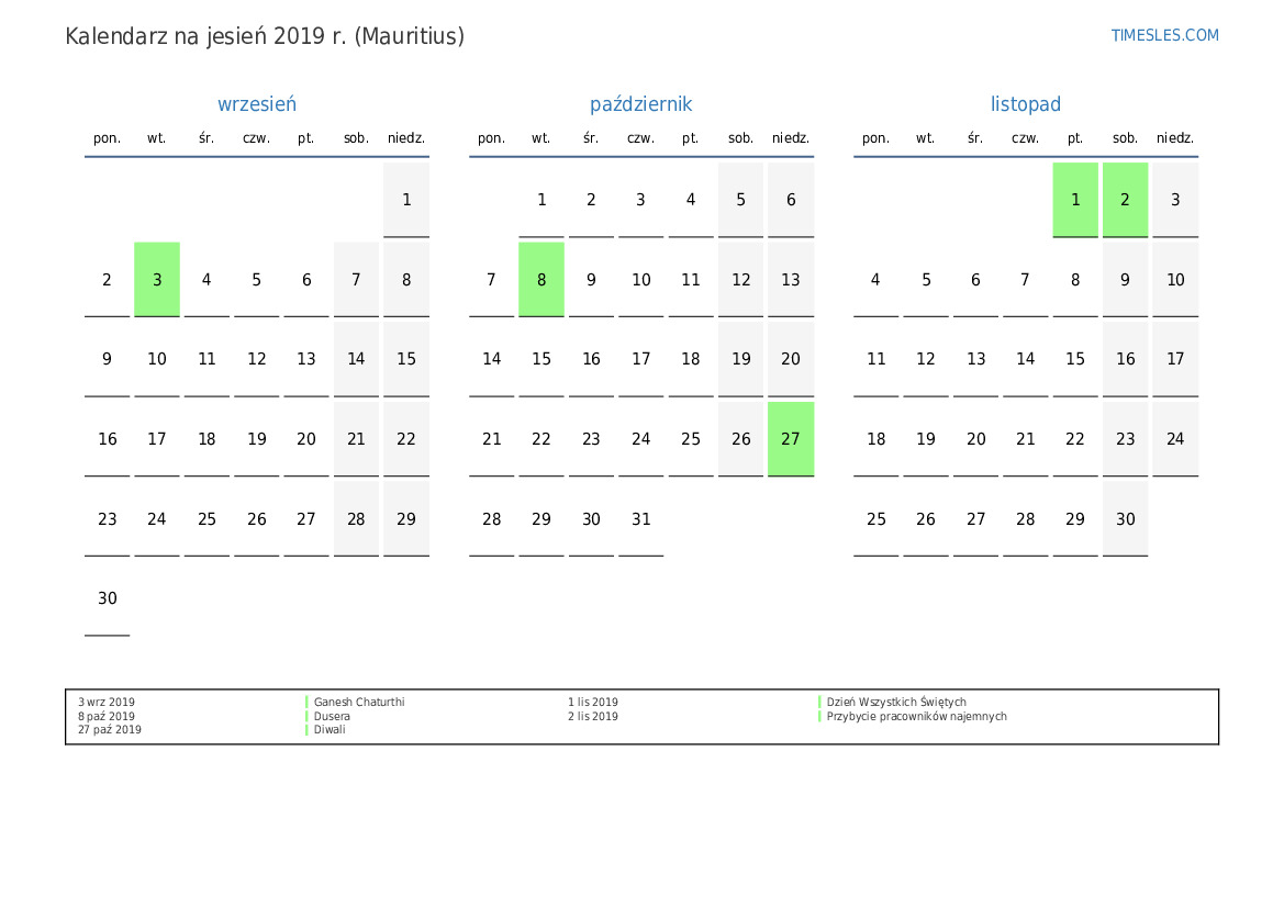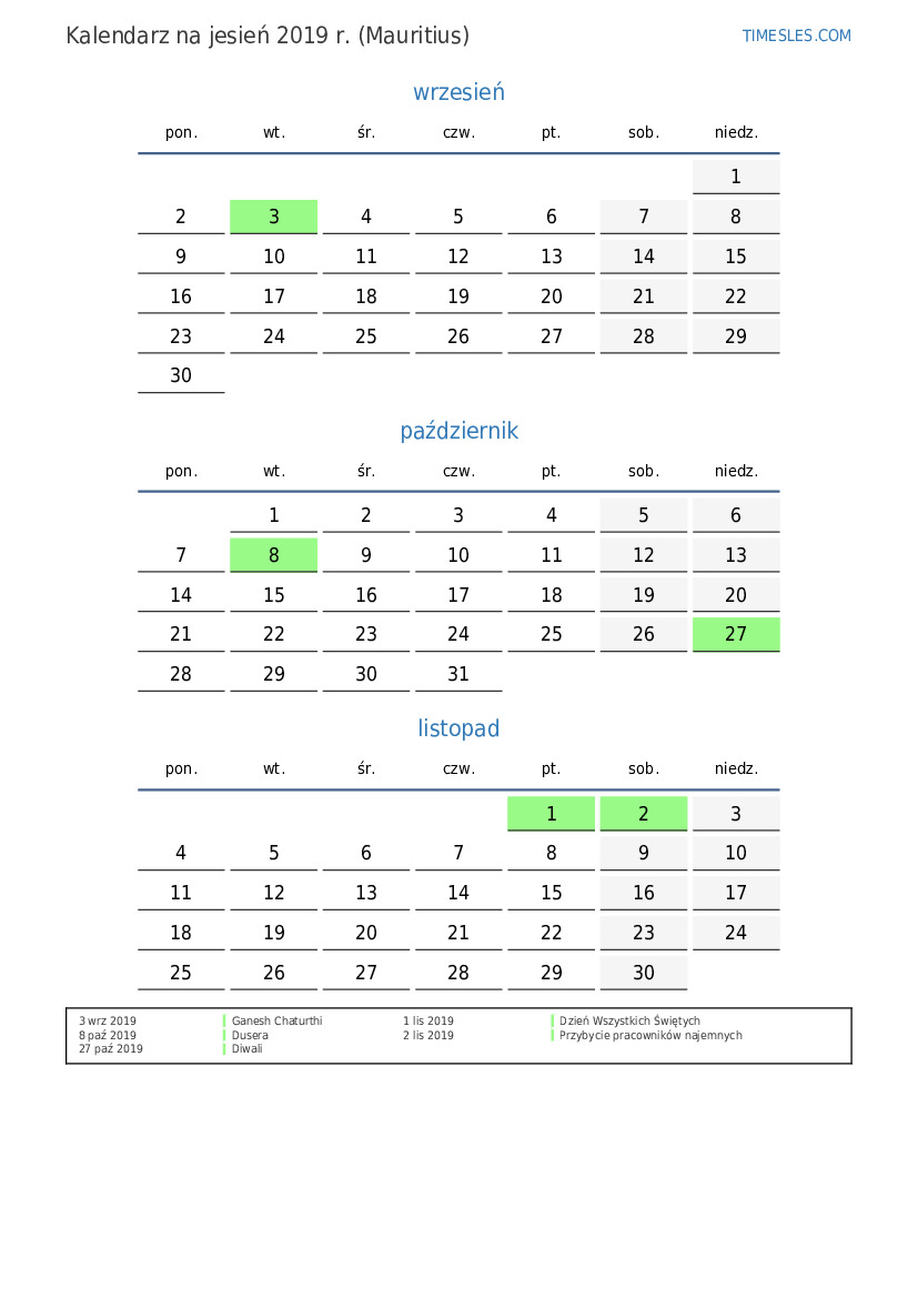 Kalendarz na jesień 2019 r. dla Mauritiusa