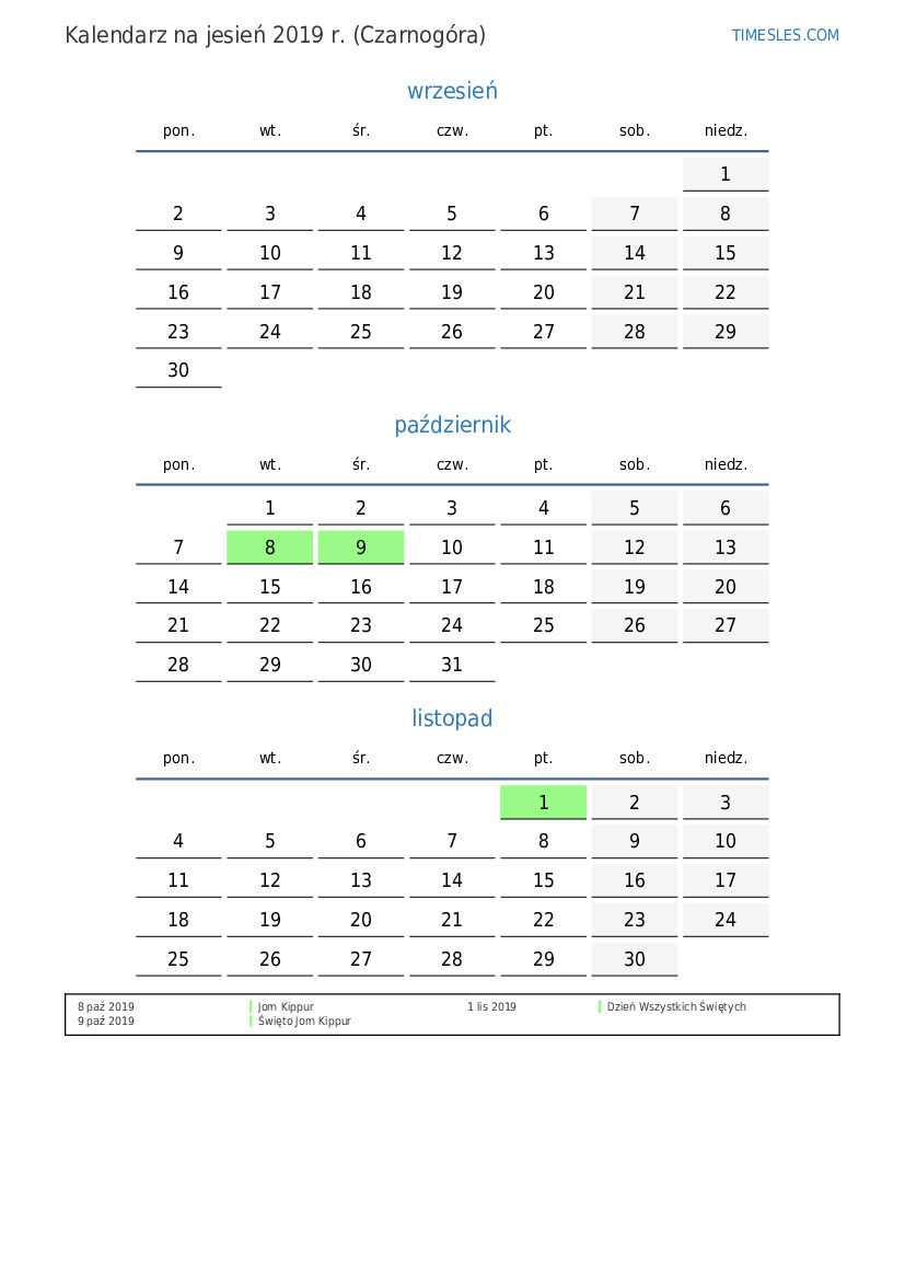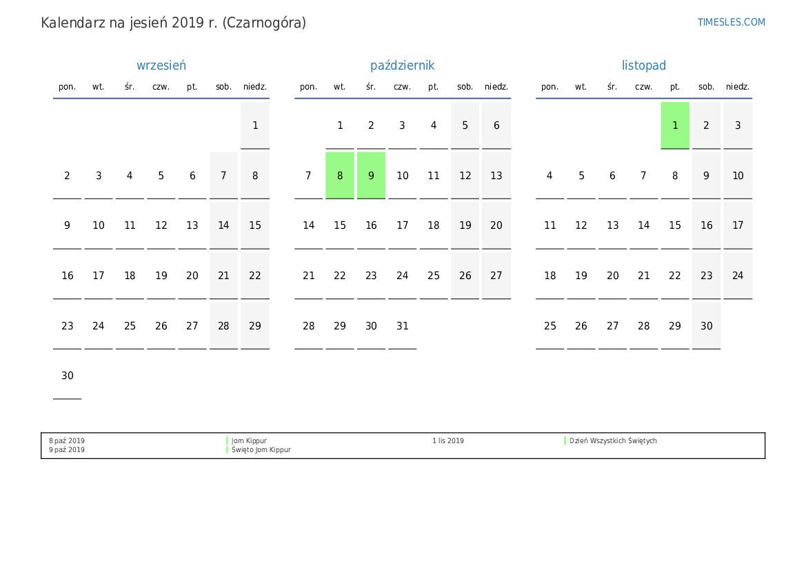 Kalendarz na jesień 2019 r. dla Czarnogóry