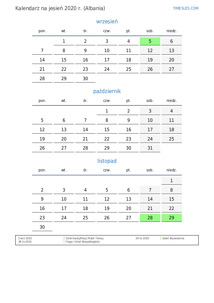 Pobierz i wydrukuj kalendarz PDF ze świętami i weekendami na jesień 2020 roku dla Albanii