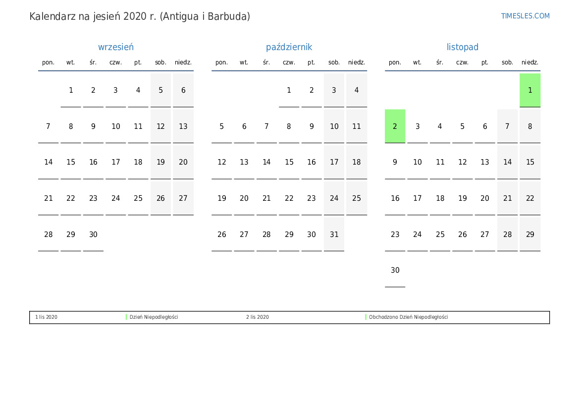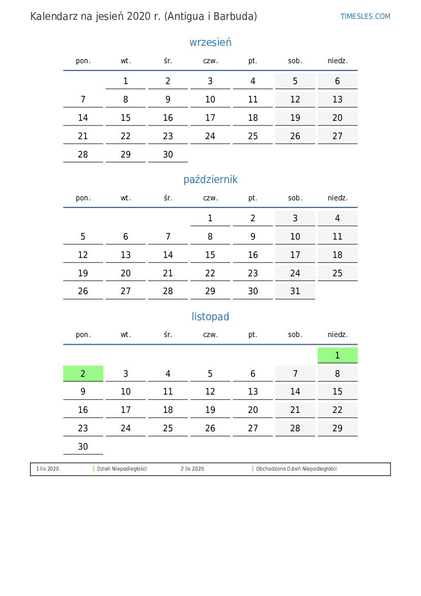Kalendarz na jesień 2020 r. dla Antigui i Barbudy