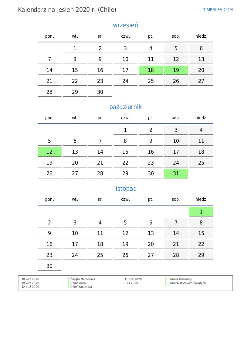 Pobierz i wydrukuj kalendarz PDF ze świętami i weekendami na jesień 2020 roku dla Chile