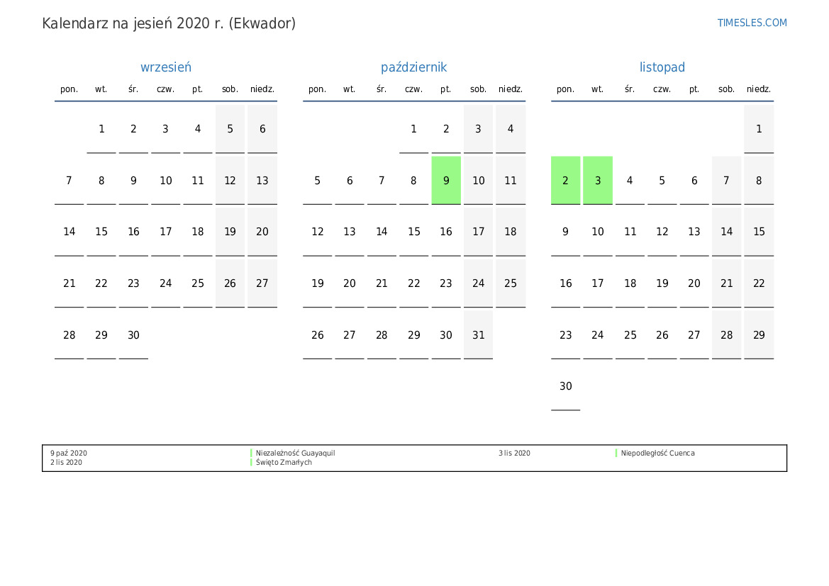 Kalendarz na jesień 2020 r. dla Ekwadoru