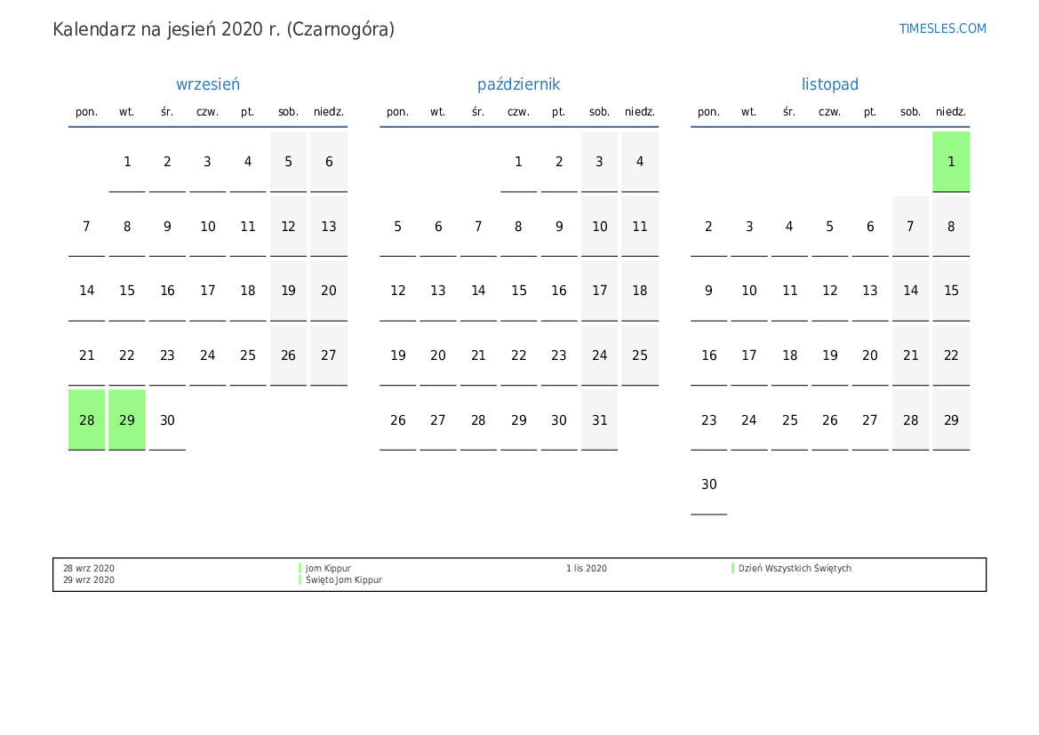 Pobierz i wydrukuj kalendarz PDF ze świętami i weekendami na jesień 2020 roku dla Czarnogóry