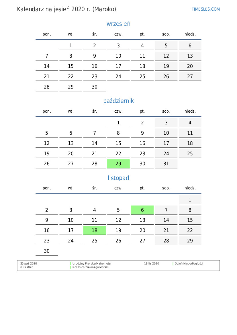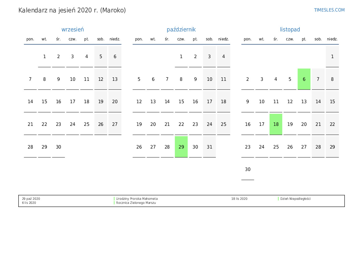 Pobierz i wydrukuj kalendarz PDF ze świętami i weekendami na jesień 2020 roku dla Maroka