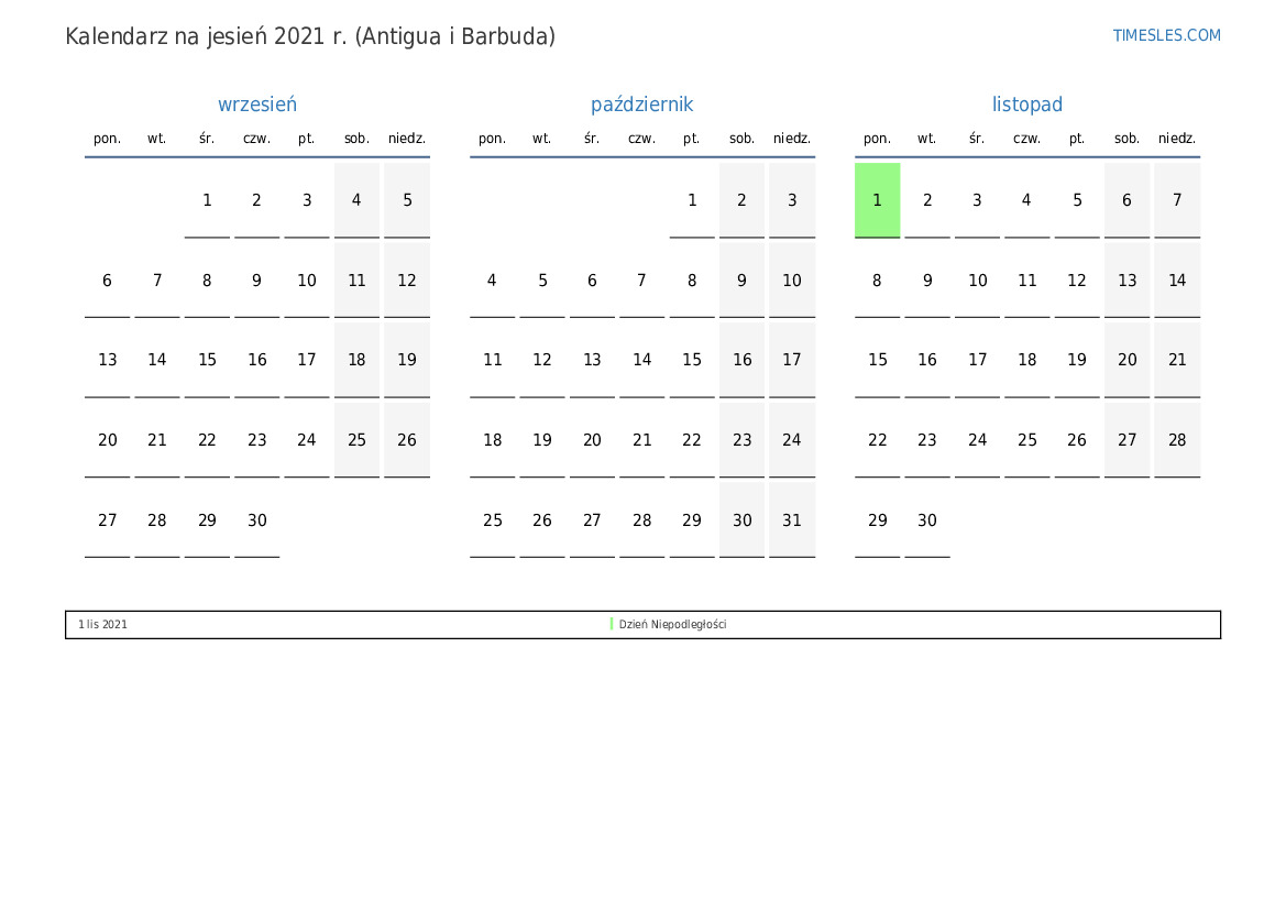 Kalendarz na jesień 2021 r. dla Antigui i Barbudy