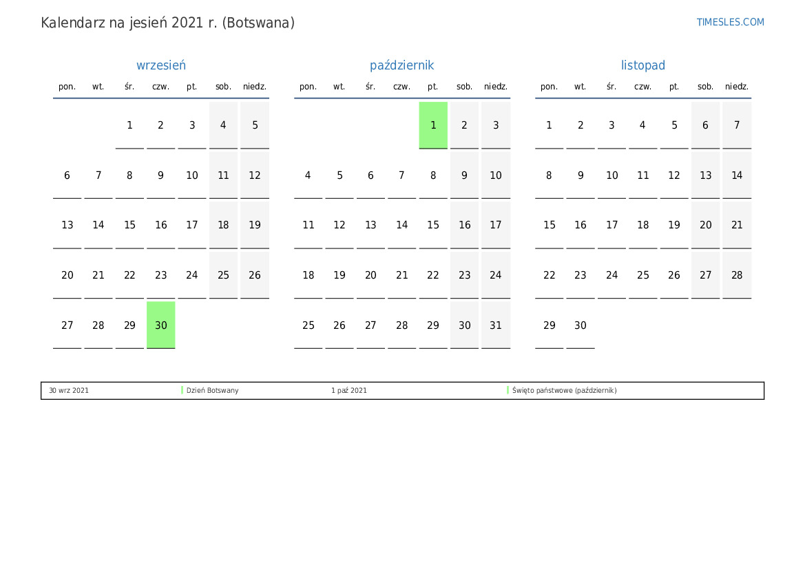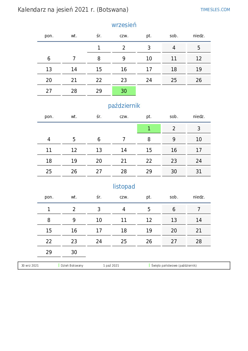 Pobierz i wydrukuj kalendarz PDF ze świętami i weekendami na jesień 2021 roku dla Botswany