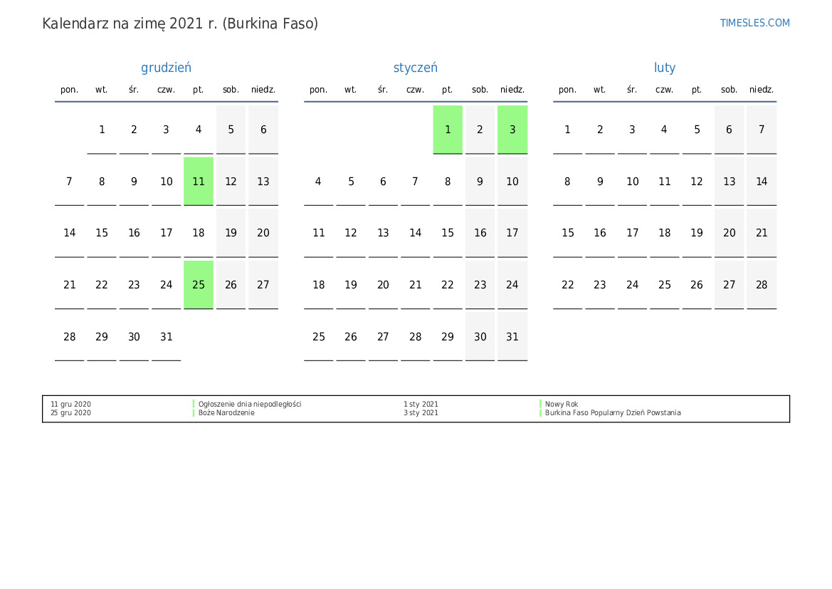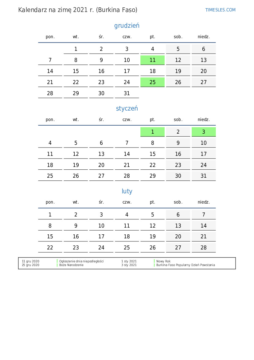 Kalendarz na jesień 2021 r. dla Burkina Faso