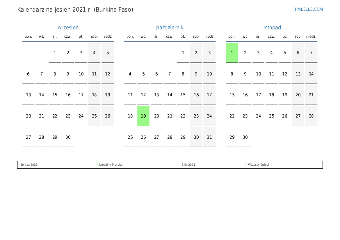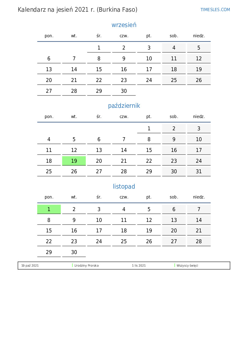 Pobierz i wydrukuj kalendarz PDF ze świętami i weekendami na jesień 2021 roku dla Burkina Faso