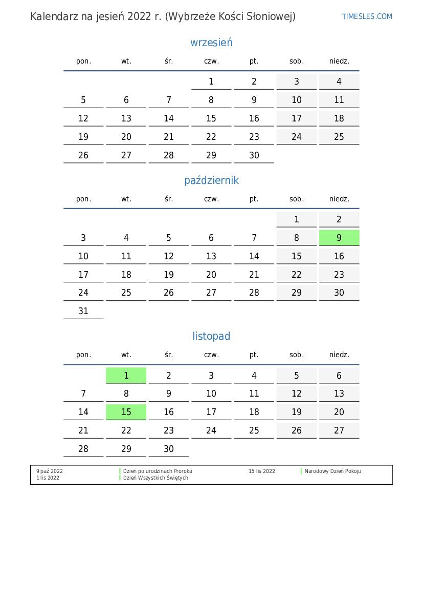 Pobierz i wydrukuj kalendarz PDF ze świętami i weekendami na jesień 2022 roku dla Wybrzeża Kości Słoniowej