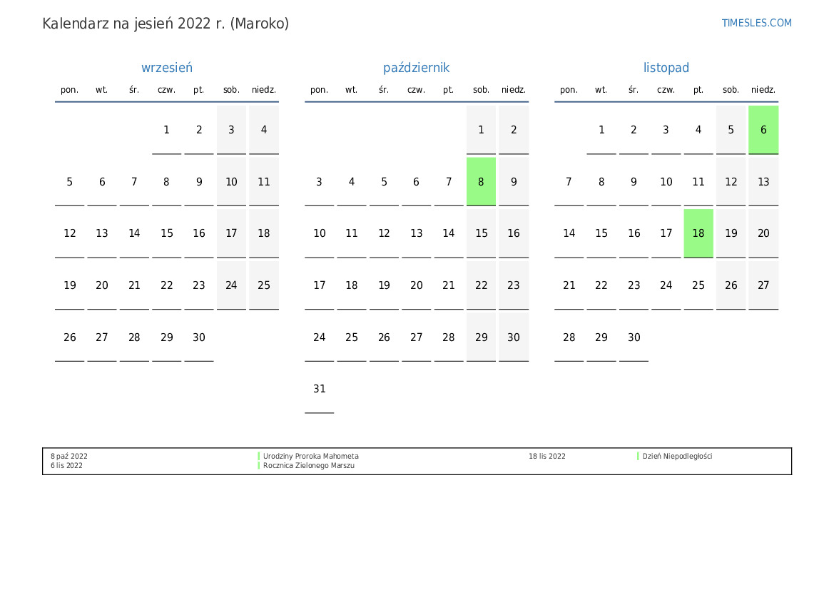 Pobierz i wydrukuj kalendarz PDF ze świętami i weekendami na jesień 2022 roku dla Maroka