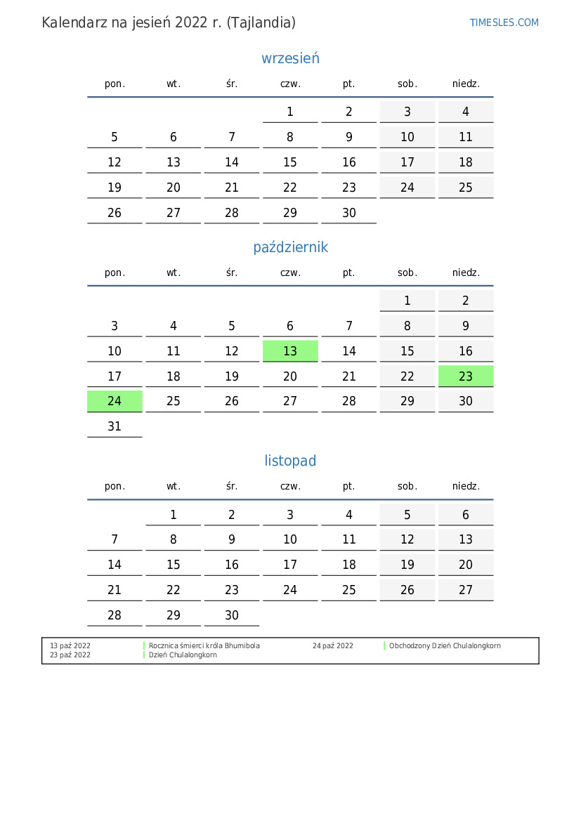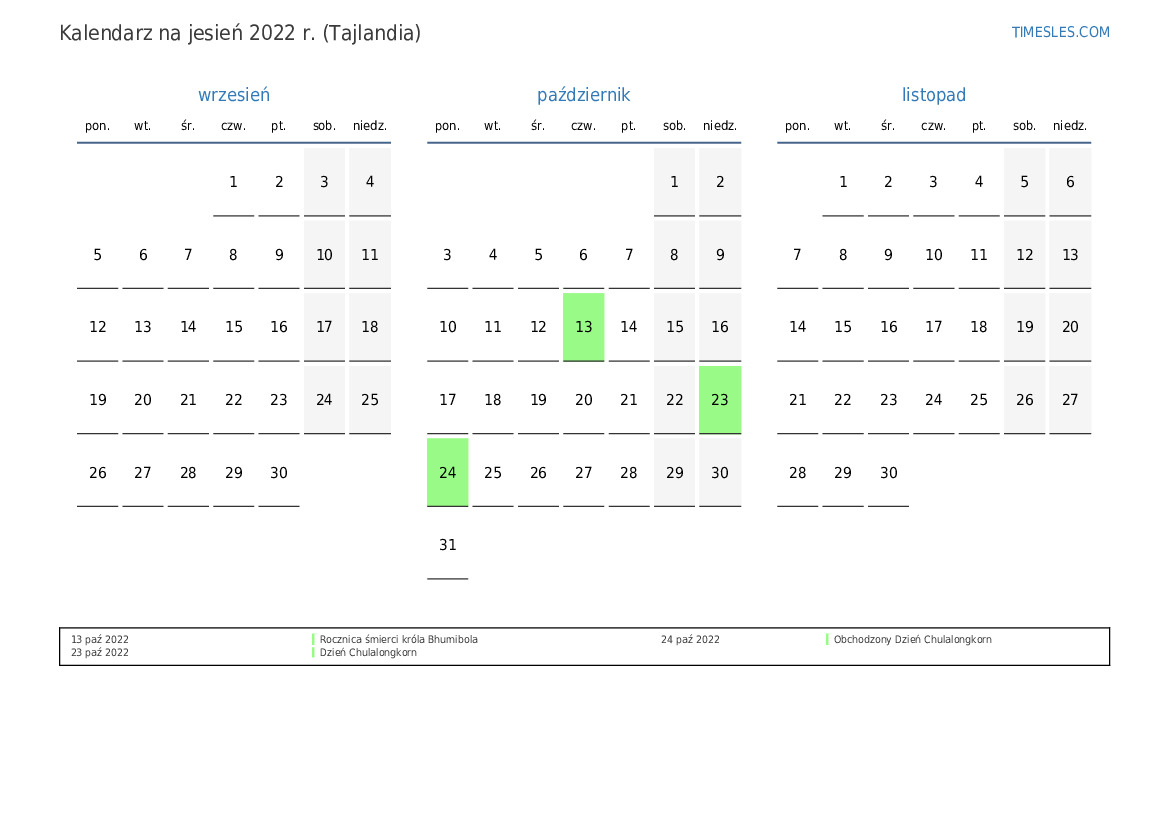 Kalendarz na jesień 2022 r. dla Tajlandii