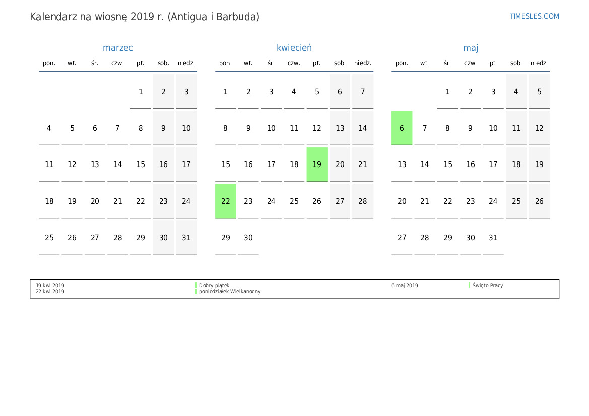 Kalendarz na wiosnę 2019 r. dla Antigui i Barbudy