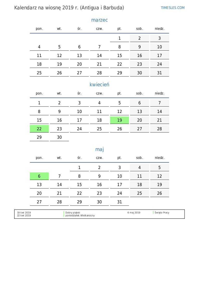 Pobierz i wydrukuj kalendarz PDF ze świętami i weekendami na wiosnę 2019 roku dla Antigui i Barbudy