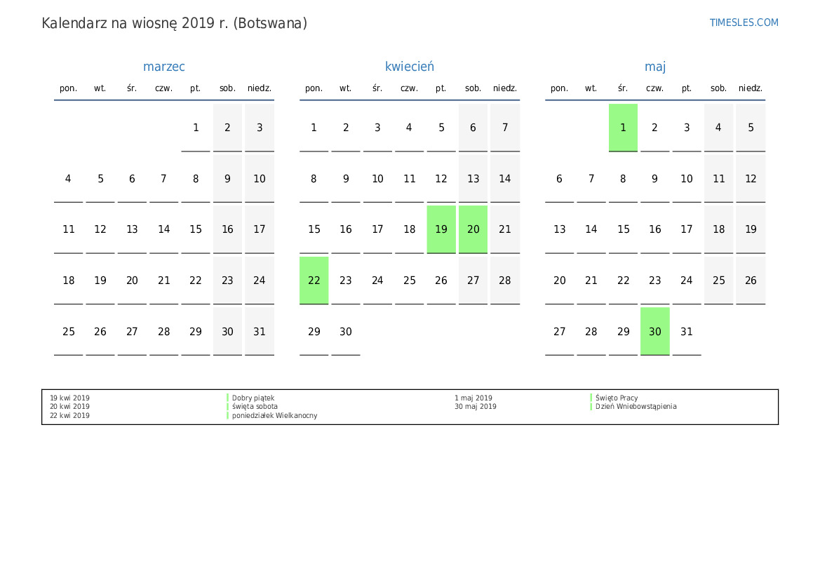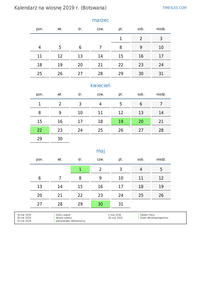 Pobierz i wydrukuj kalendarz PDF ze świętami i weekendami na wiosnę 2019 roku dla Botswany