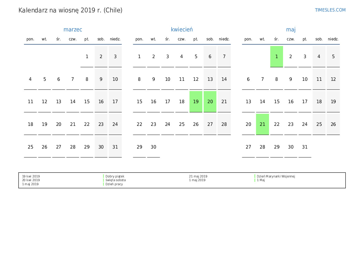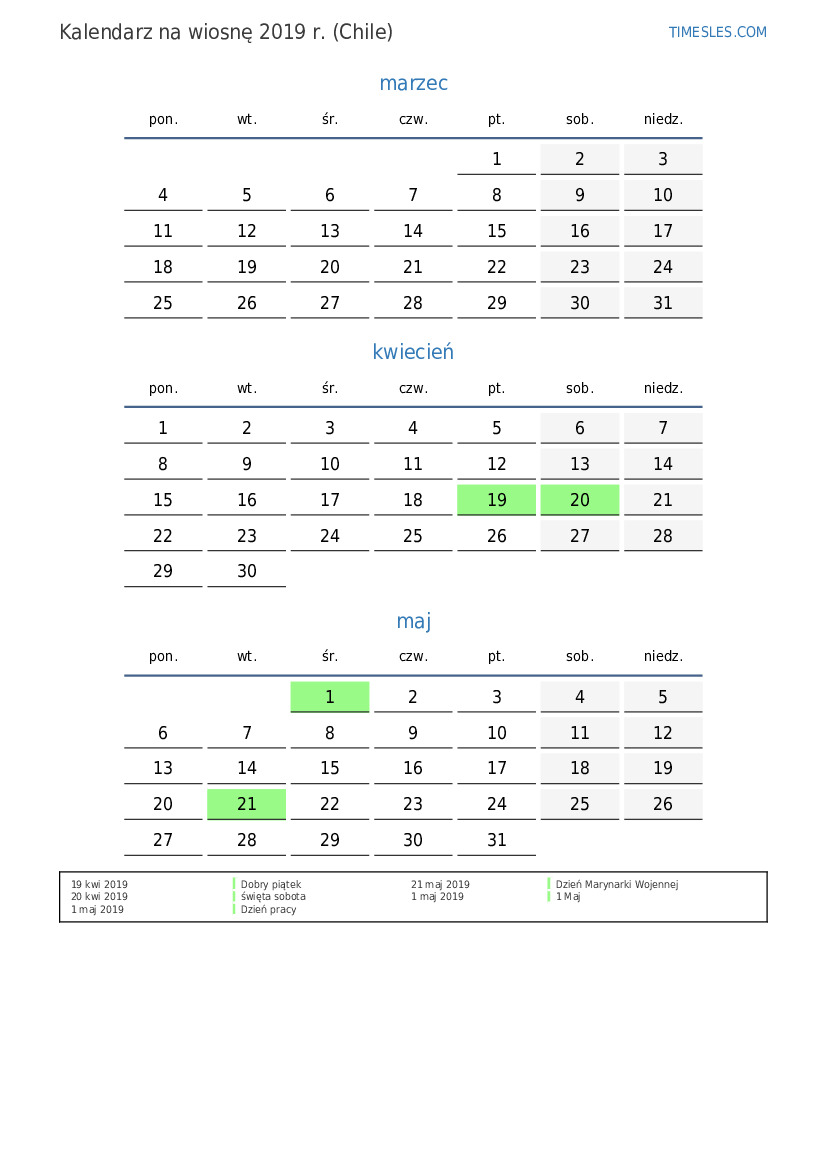 Pobierz i wydrukuj kalendarz PDF ze świętami i weekendami na wiosnę 2019 roku dla Chile