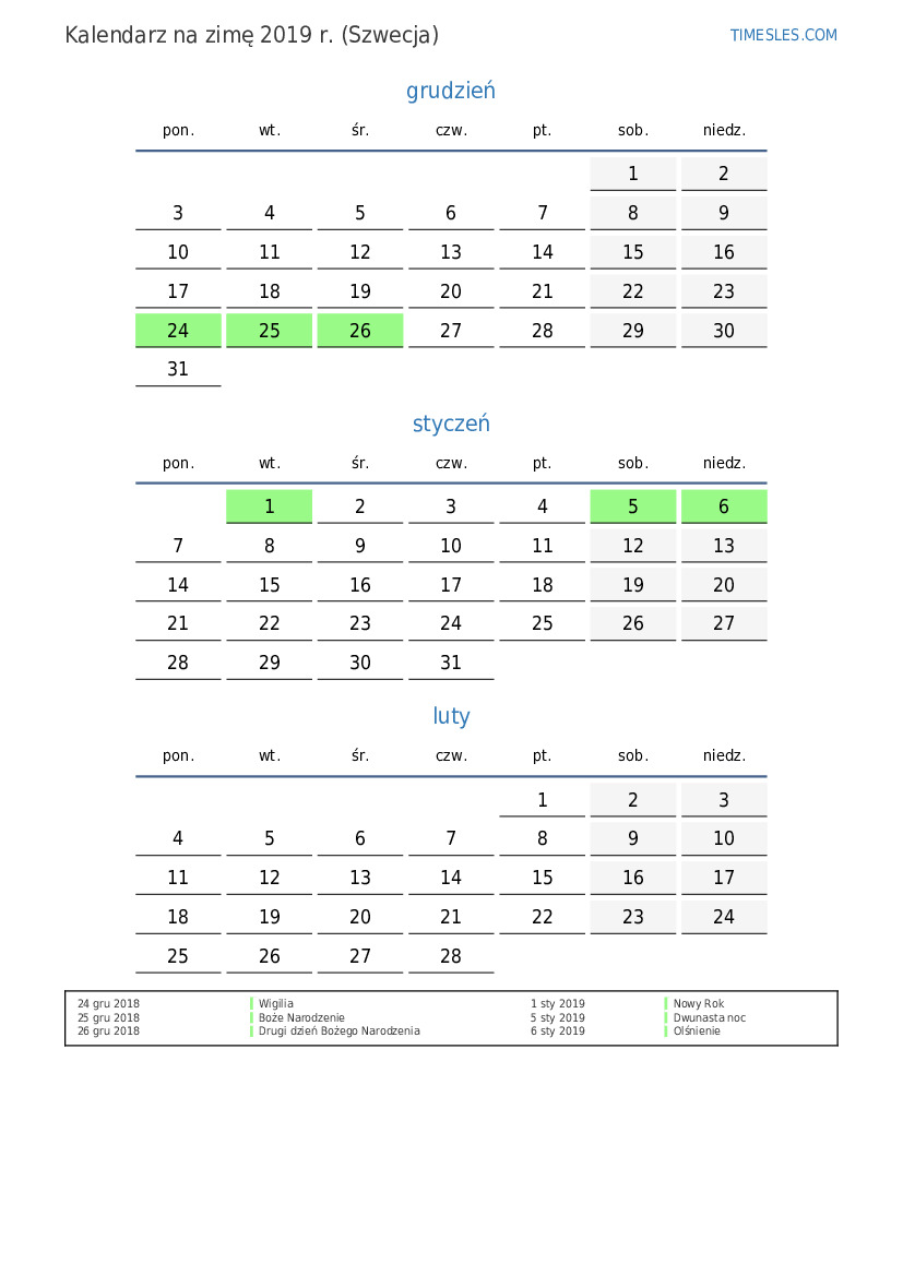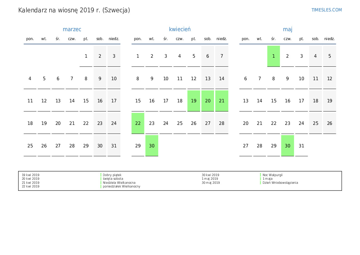 Kalendarz na wiosnę 2019 r. dla Szwecji