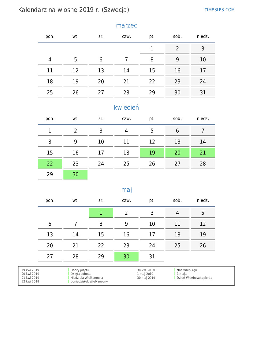 Pobierz i wydrukuj kalendarz PDF ze świętami i weekendami na wiosnę 2019 roku dla Szwecji