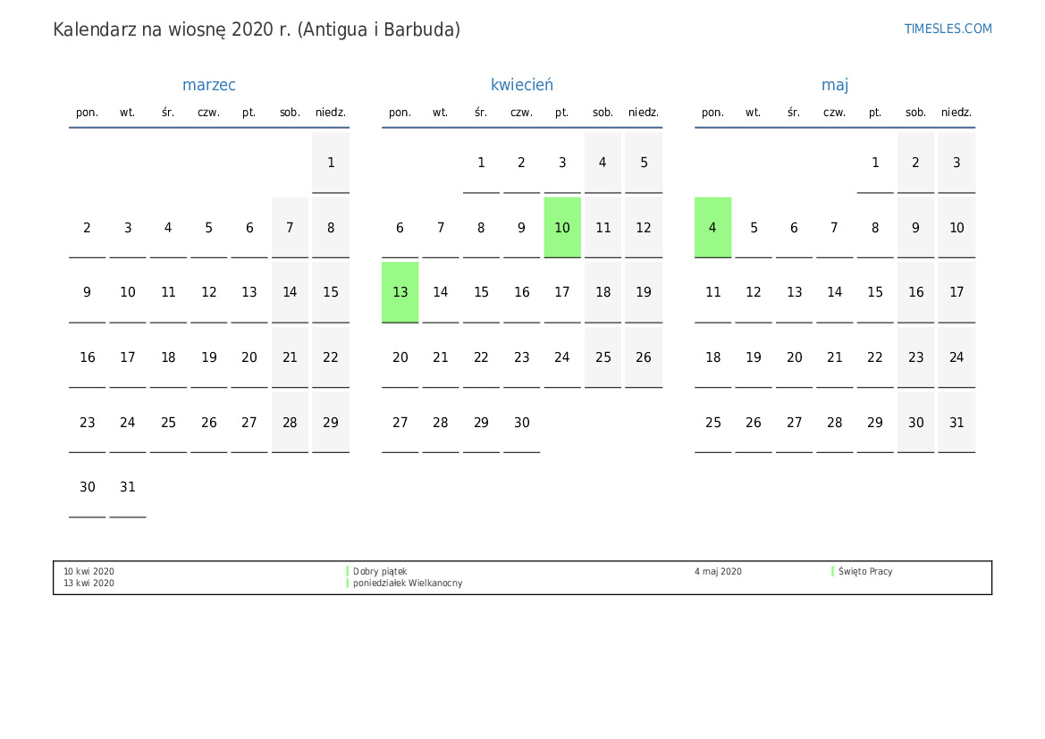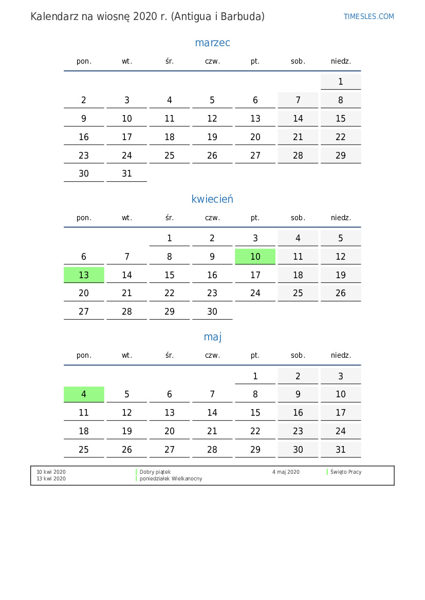 Pobierz i wydrukuj kalendarz PDF ze świętami i weekendami na wiosnę 2020 roku dla Antigui i Barbudy