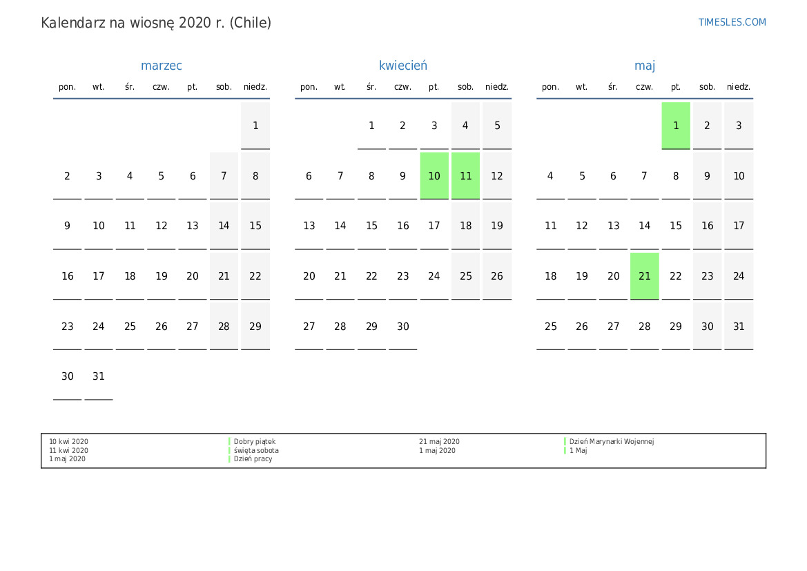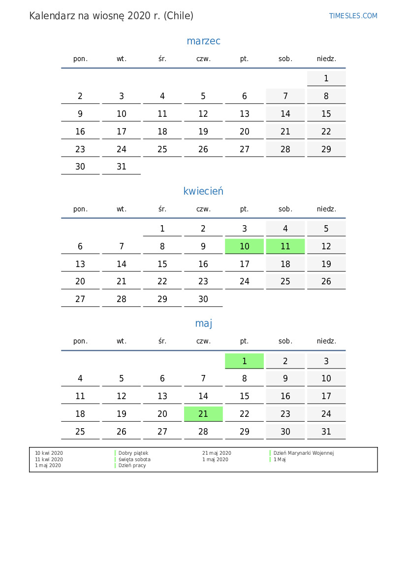 Pobierz i wydrukuj kalendarz PDF ze świętami i weekendami na wiosnę 2020 roku dla Chile