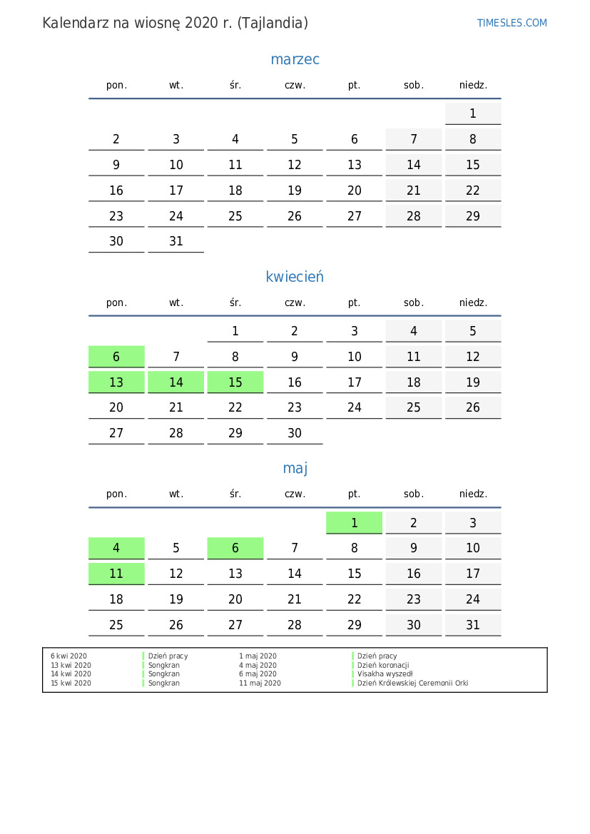 Pobierz i wydrukuj kalendarz PDF ze świętami i weekendami na wiosnę 2020 roku dla Tajlandii