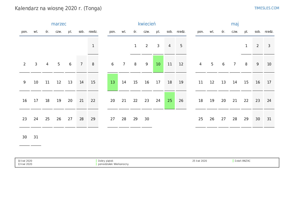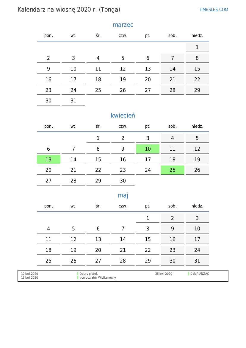 Pobierz i wydrukuj kalendarz PDF ze świętami i weekendami na wiosnę 2020 roku dla Tonga
