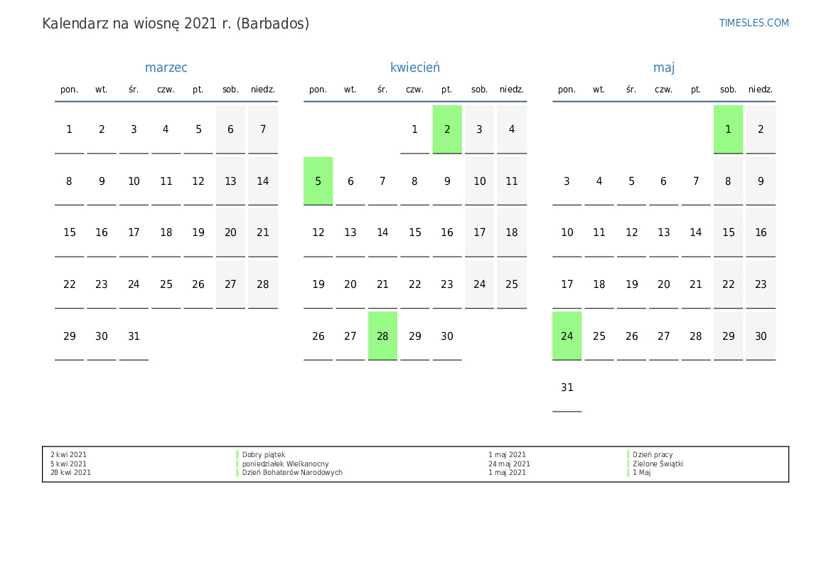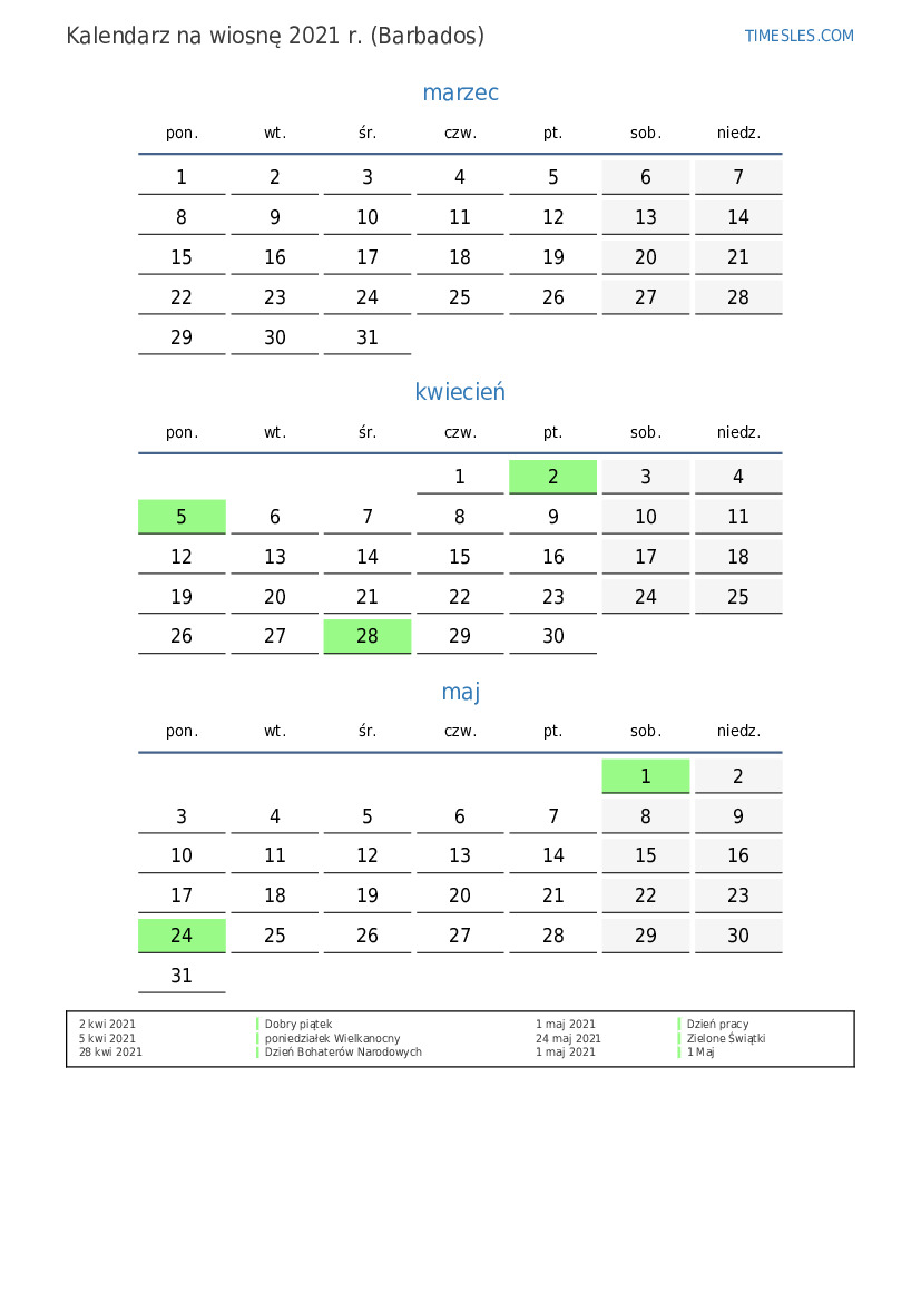 Kalendarz na wiosnę 2021 r. dla Barbadosu
