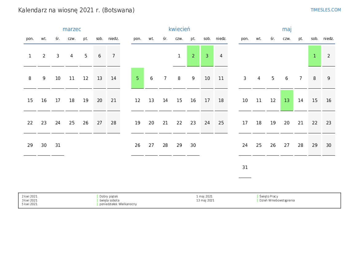 Pobierz i wydrukuj kalendarz PDF ze świętami i weekendami na wiosnę 2021 roku dla Botswany