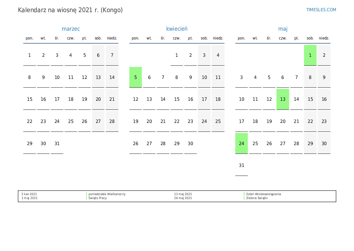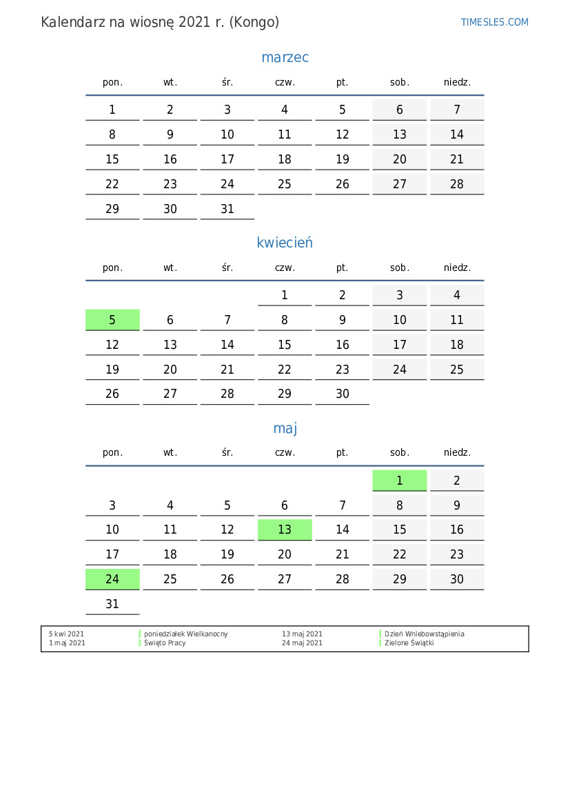 Pobierz i wydrukuj kalendarz PDF ze świętami i weekendami na wiosnę 2021 roku dla Konga