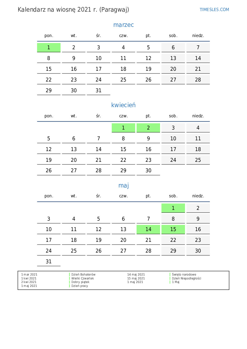 Kalendarz na wiosnę 2021 r. dla Paragwaju