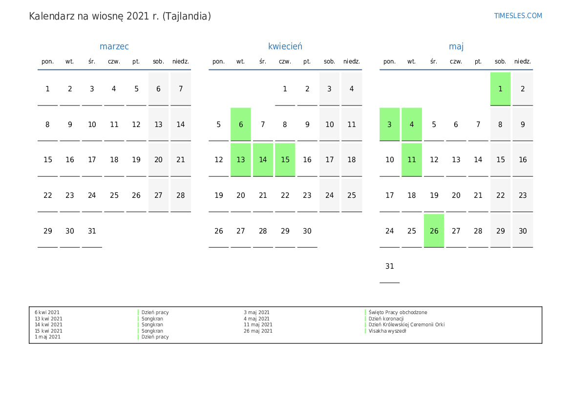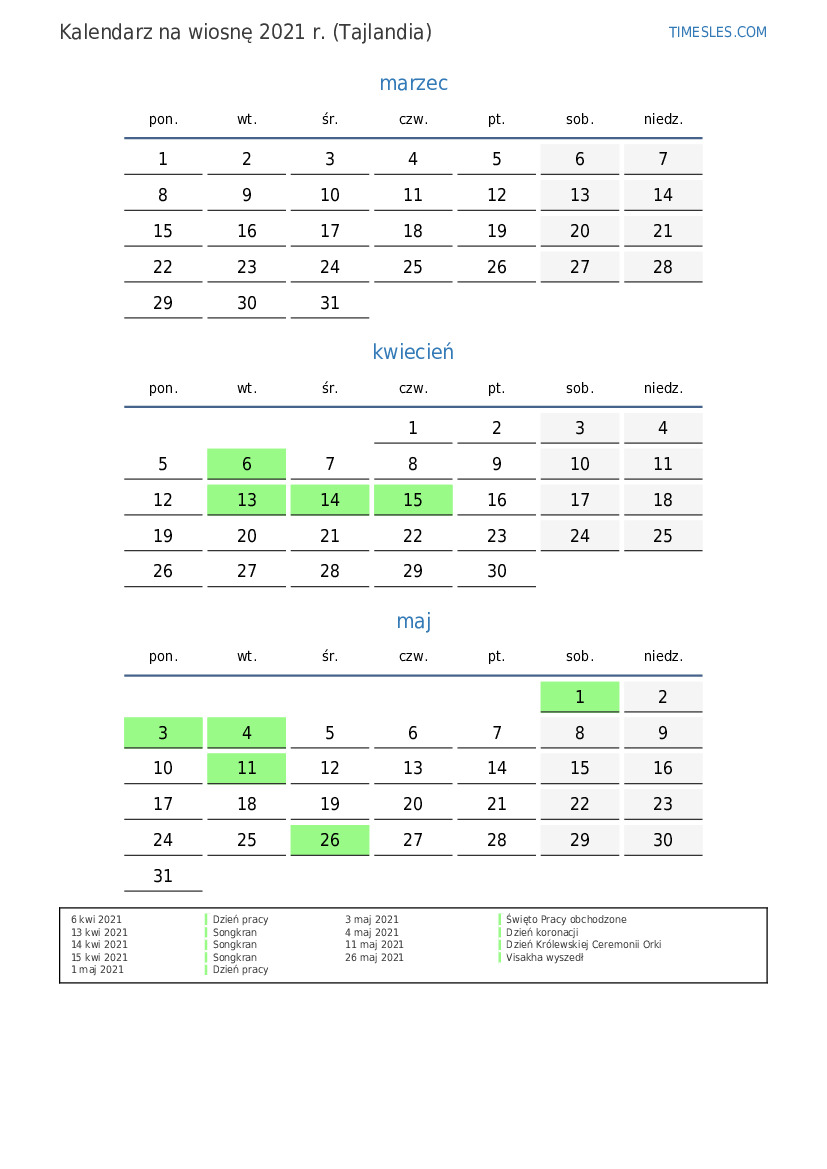 Pobierz i wydrukuj kalendarz PDF ze świętami i weekendami na wiosnę 2021 roku dla Tajlandii