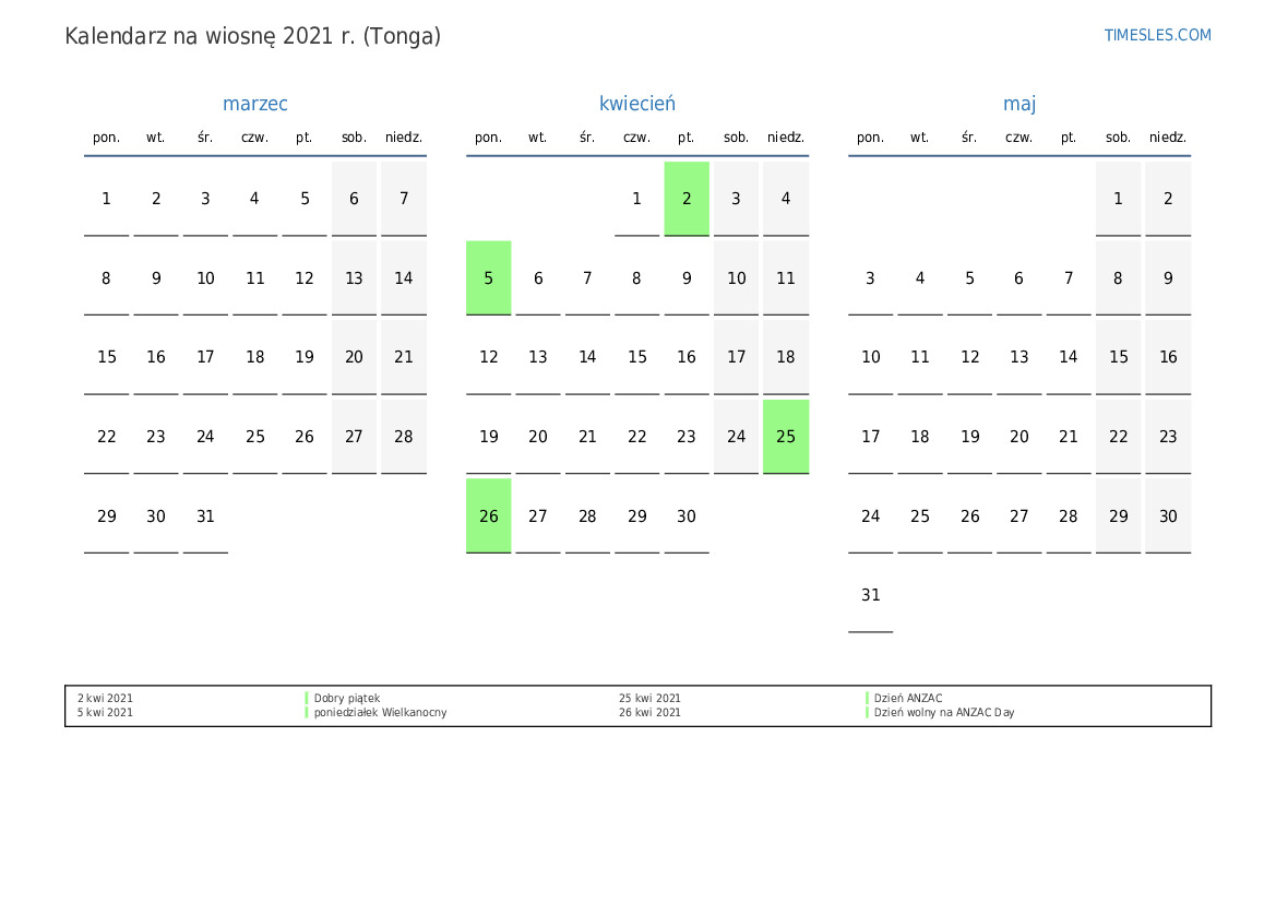 Pobierz i wydrukuj kalendarz PDF ze świętami i weekendami na wiosnę 2021 roku dla Tonga
