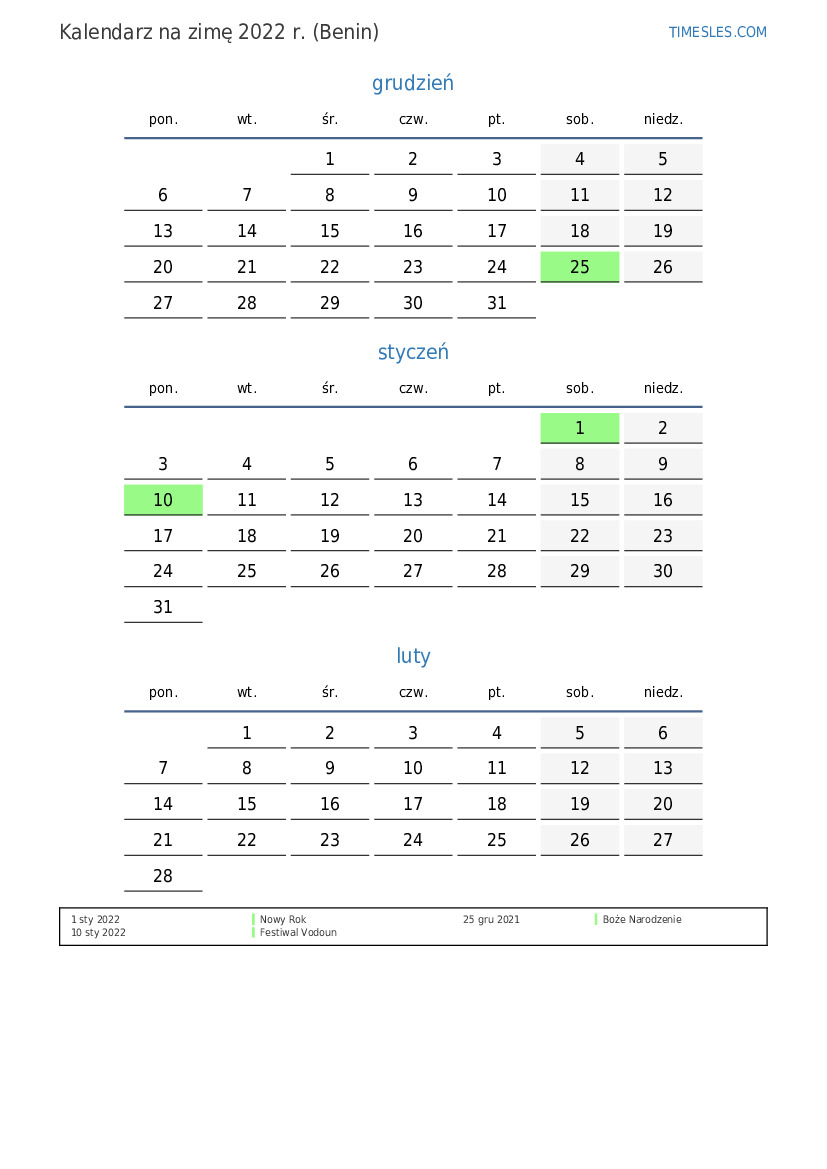 Kalendarz na wiosnę 2022 r. dla Beninu