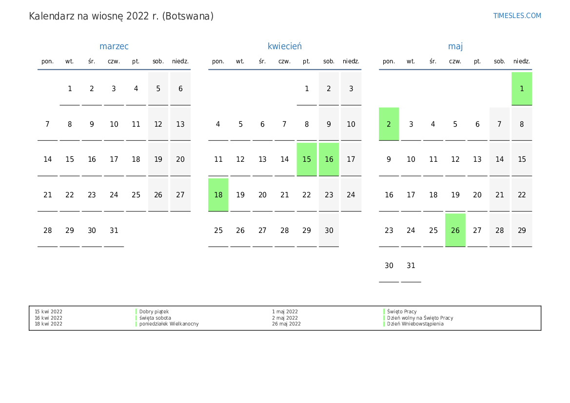 Pobierz i wydrukuj kalendarz PDF ze świętami i weekendami na wiosnę 2022 roku dla Botswany