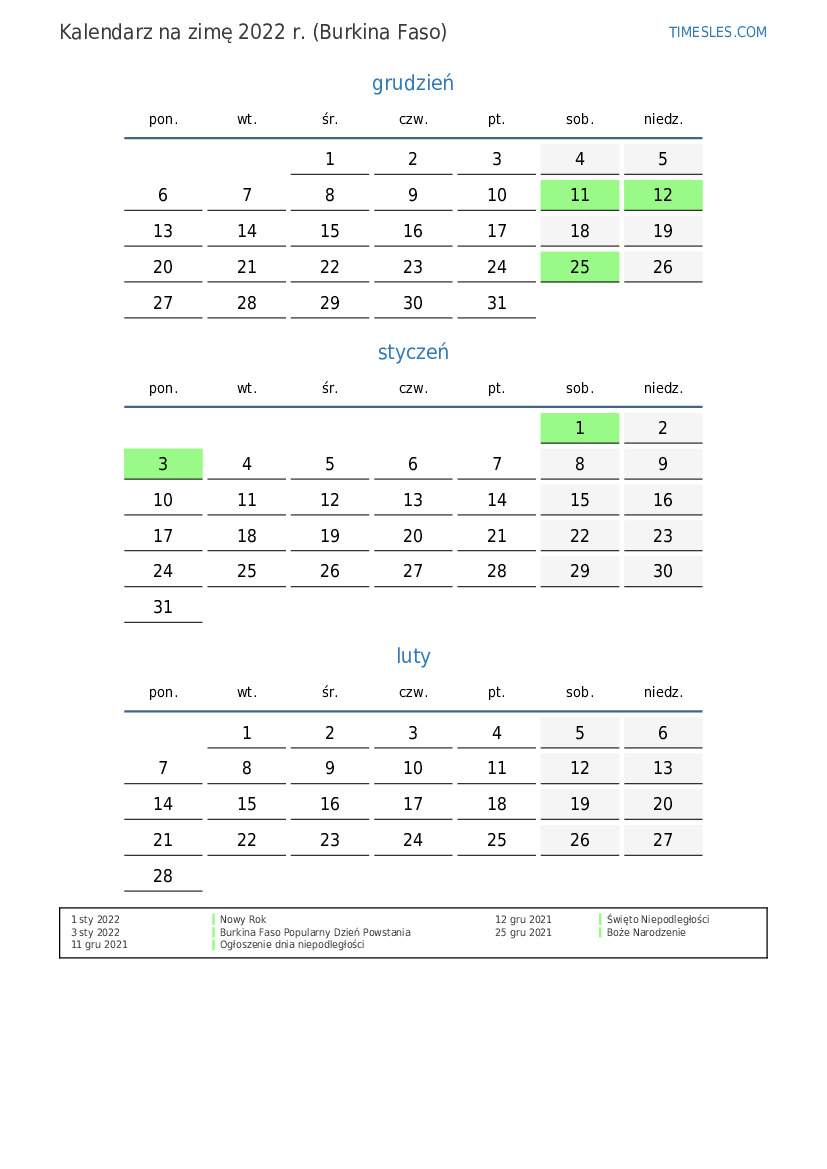 Kalendarz na wiosnę 2022 r. dla Burkina Faso