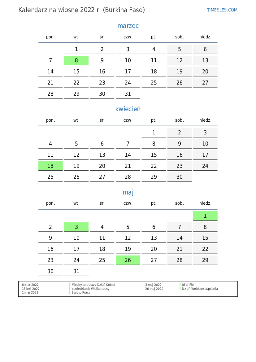 Pobierz i wydrukuj kalendarz PDF ze świętami i weekendami na wiosnę 2022 roku dla Burkina Faso