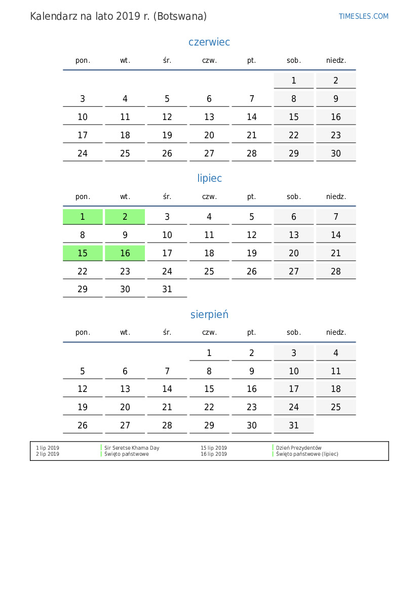 Kalendarz na lato 2019 r. dla Botswany
