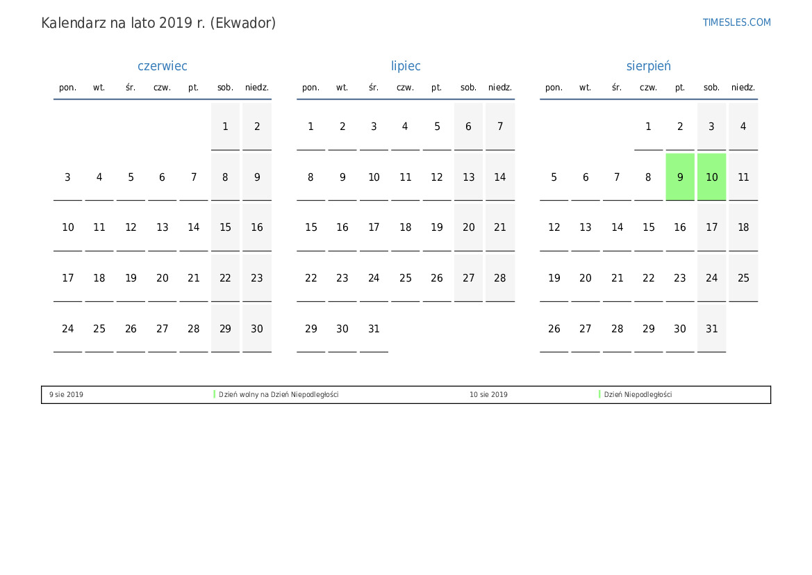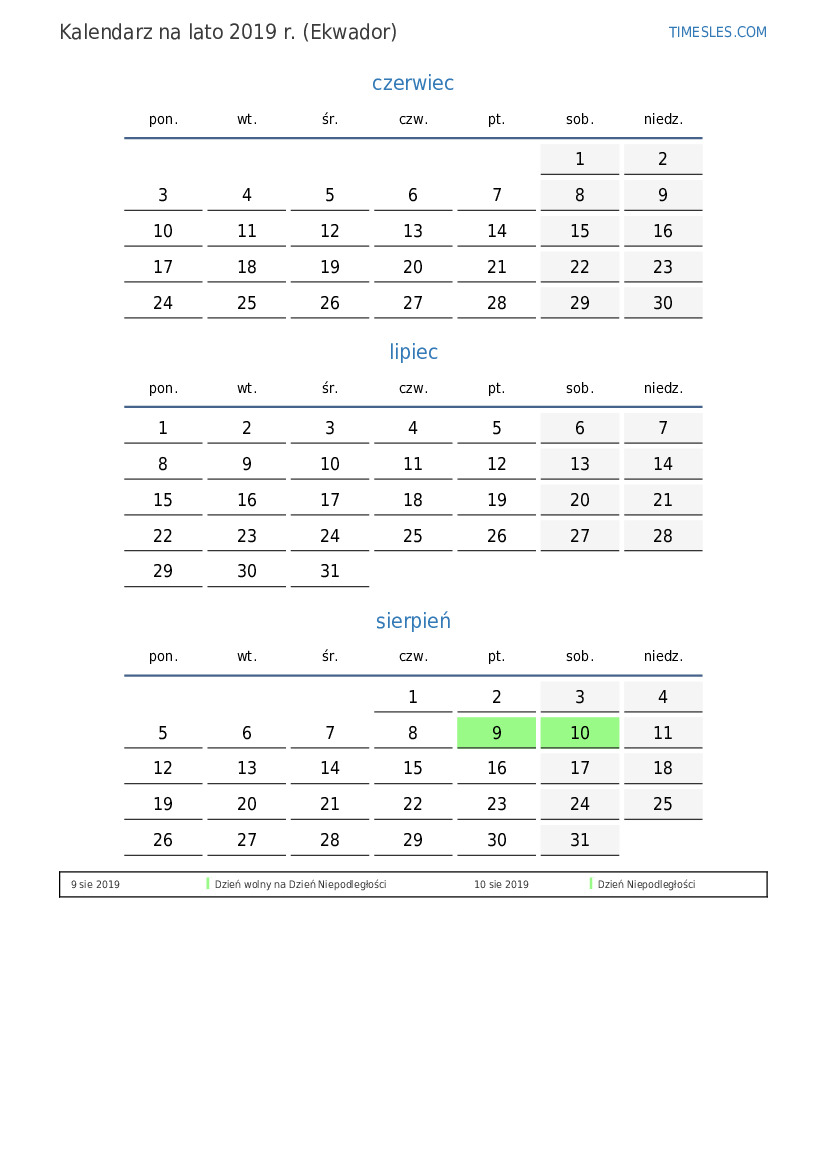 Pobierz i wydrukuj kalendarz PDF ze świętami i weekendami na lato 2019 roku dla Ekwadoru