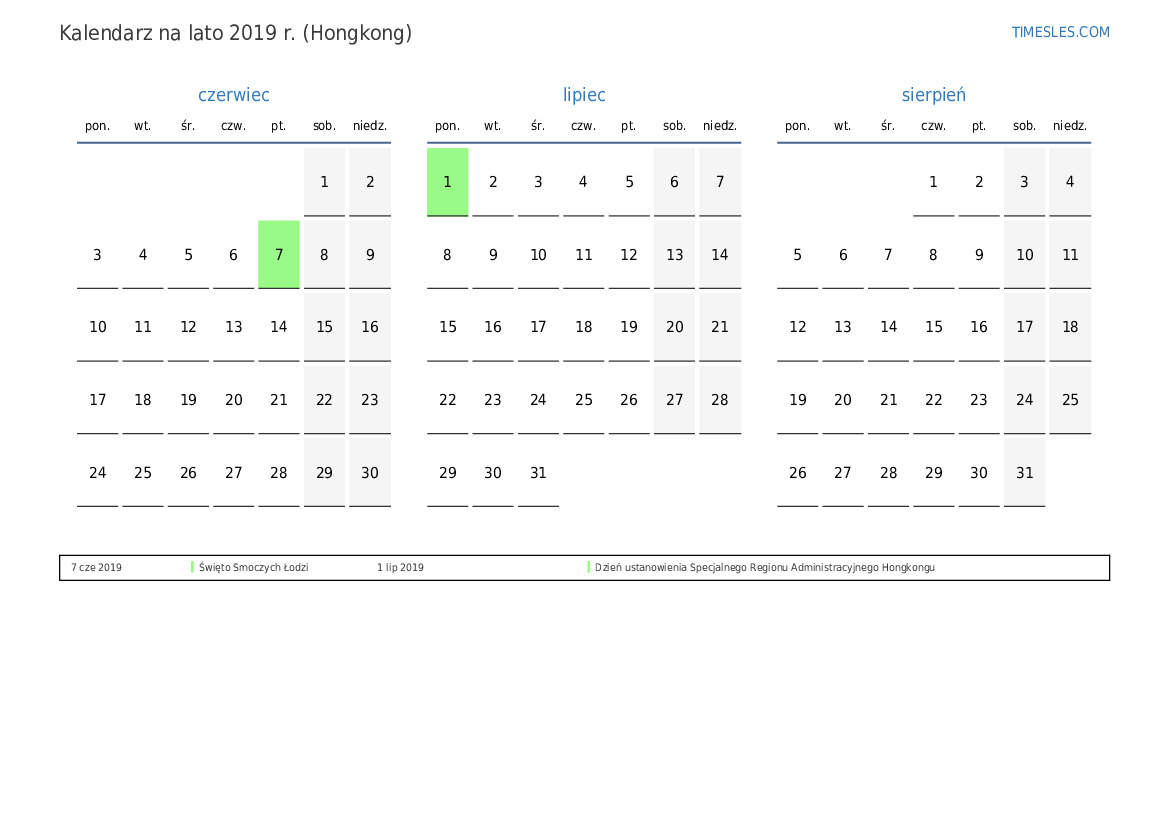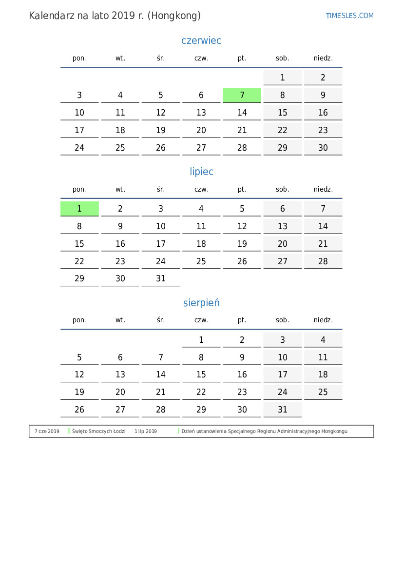 Pobierz i wydrukuj kalendarz PDF ze świętami i weekendami na lato 2019 roku dla Hongkongu