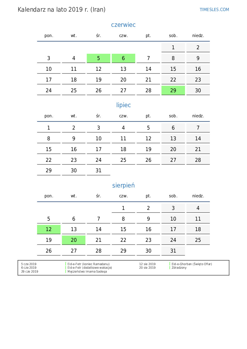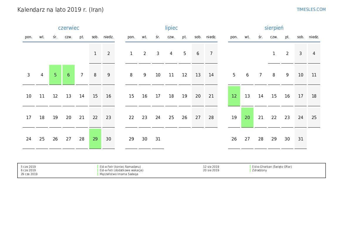 Pobierz i wydrukuj kalendarz PDF ze świętami i weekendami na lato 2019 roku dla Iranu