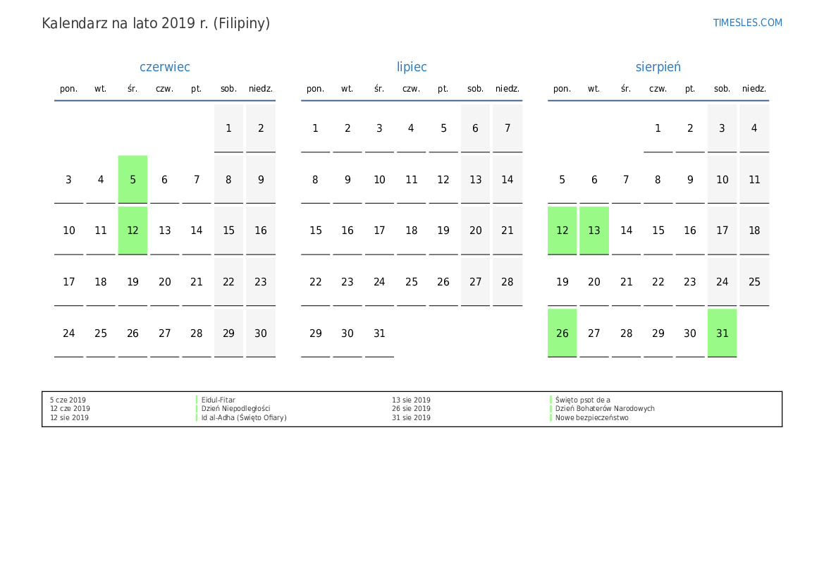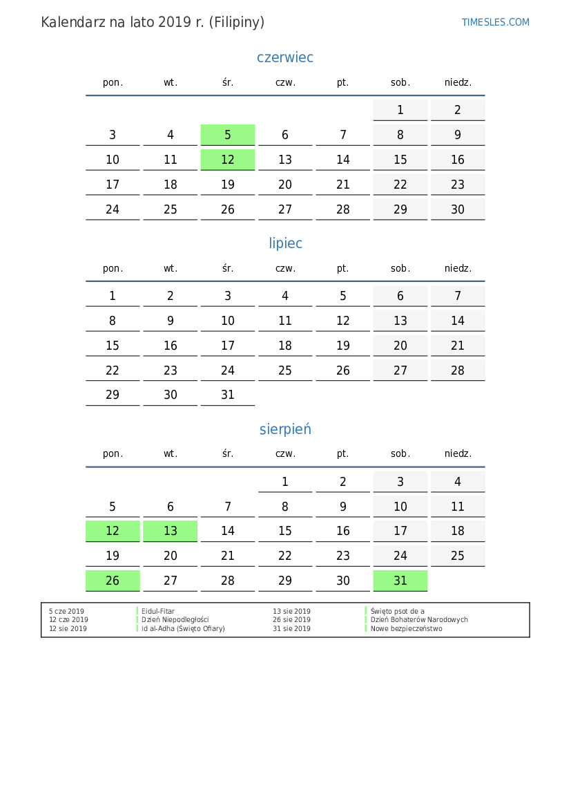 Pobierz i wydrukuj kalendarz PDF ze świętami i weekendami na lato 2019 roku dla Filipin